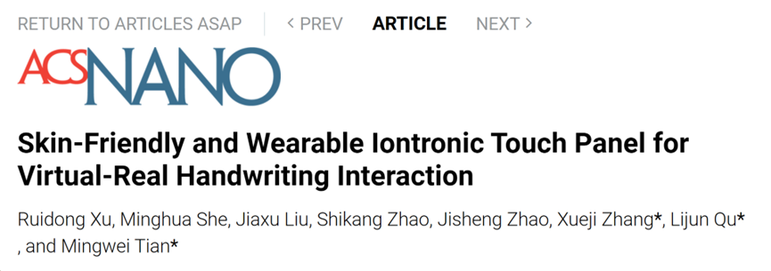 Ruidong Xu, Minghua She, Jiaxu Liu, Shikang Zhao, Jisheng Zhao, Xueji Zhang, Lijun Qu, Mingwei Tian. Skin-Friendly and Wearable Iontronic Touch Panel for Virtual-Real Handwriting Interaction. ACS Nano, 2023; DOI: 10.1021/acsnano.2c12612