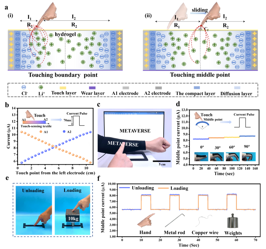 通过利用表面电容式触摸感应原理以及自生长组装技术,离电式织物触摸板具有良好的界面牢度并可实现对触摸位置的实时定位,展示出高精度手写交互功能(图1 a-c)。