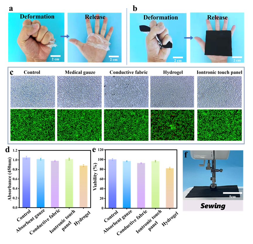 与纯水凝胶基触摸设备相比较而言,织物触摸板具有干爽、吸湿、尺寸稳定性强等特性,适合人体长期穿戴使用(图5 a,b)。进一步,采用体外细胞培养,证明织物触摸板具有良好的生物相容性 (图5 c-e)。此外,通过经典的纺织加工手段,可将离电式织物触摸板与各类服装进行集成使用(图5 d)。