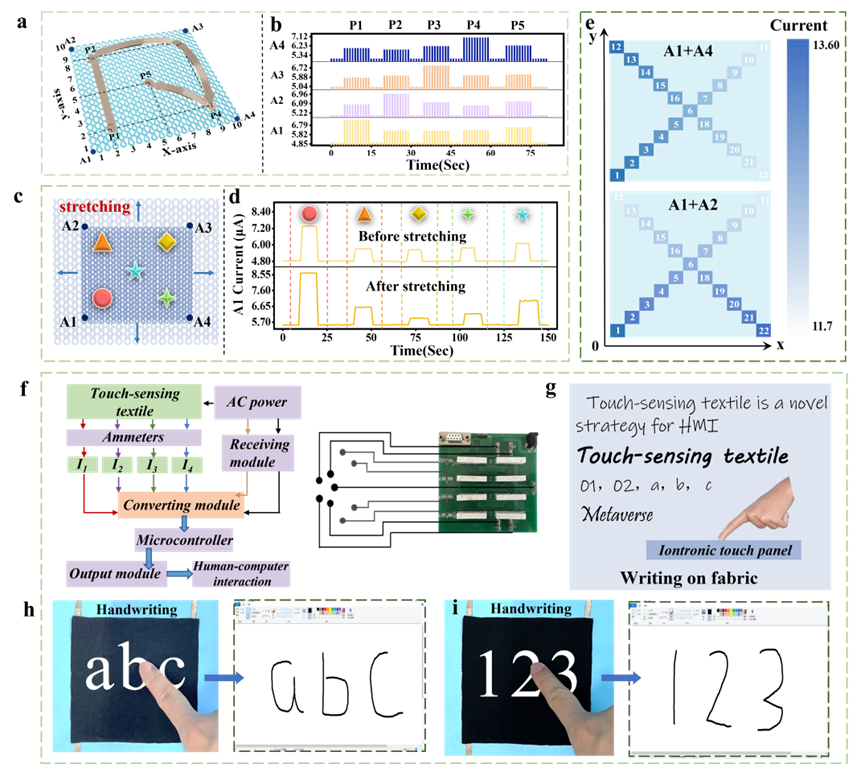 在明确一维触摸定位原理的基础上,通过增设电极和理论计算,将离电式织物触摸板进行坐标化,实现触摸位置的二维坐标定位。此外,二维坐标定位功能仍具有应变-应力双不灵敏特性(图4 a-e)。进一步,通过多路信息采集系统和python交互语言的设计,可实现高精度实时手写展示(图4 f-i)。