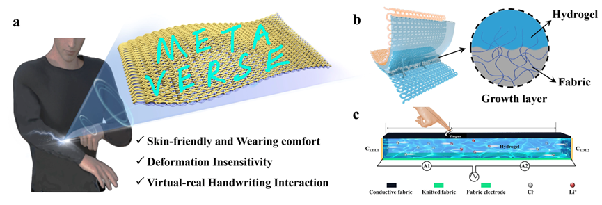 针对上述瓶颈,青岛大学田明伟教授、曲丽君教授团队与深圳大学张学记教授团队在前期研究基础上,报道了一种亲肤、可穿戴的离电式织物触摸板,通过自生长技术将离子水凝胶与织物基底复合,获得了优异的界面牢度。此外,利用表面电容式触摸感应原理,离电式织物触摸板具有应力-应变双不灵敏、超高精度触摸轨迹识别等特性,可实现生动的手写及绘画展示。相关工作以“Skin-Friendly and Wearable Iontronic Touch Panel for Virtual-Real Handwriting Interaction”为题目发表在ACS Nano 上。