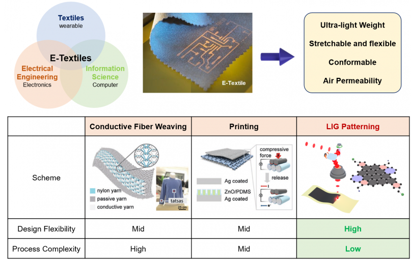 与依赖有毒化学品或光学掩模进行图案化的传统方法相比,合作研究团队采用激光直接图案化技术在电子纺织品上创建激光诱导石墨烯(LIG)。这种方法成功生产了基于石墨烯的电子纺织品。
